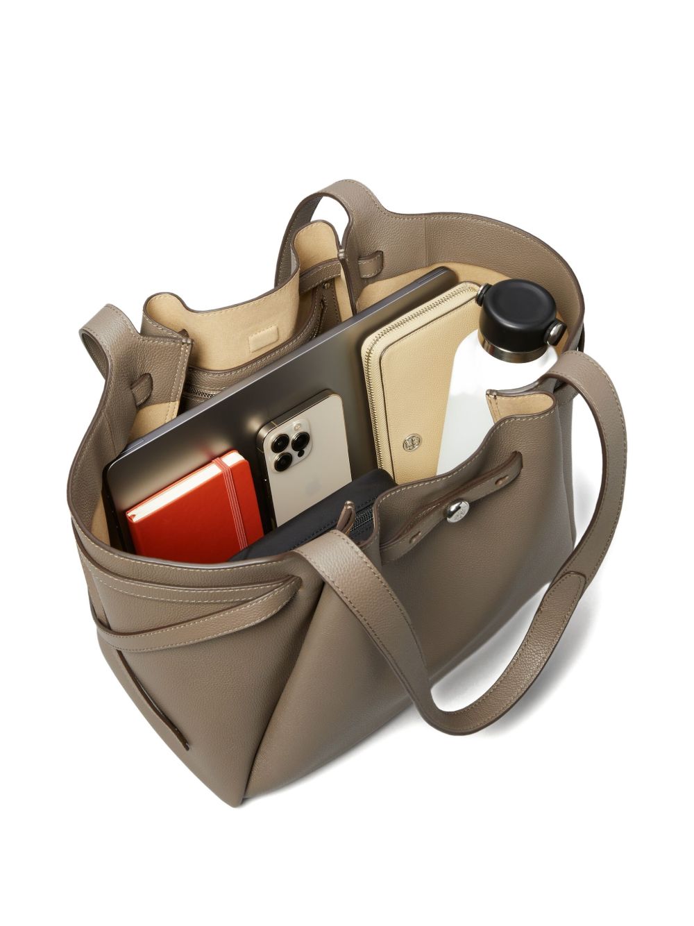 gray leather texture dual top handles drawstring closure side straps open interior Romy leather tote bag Size and Fit - DEPTH 17 cm. HANDLE 31 cm. HEIGHT 29 cm. WIDTH 31 cm.